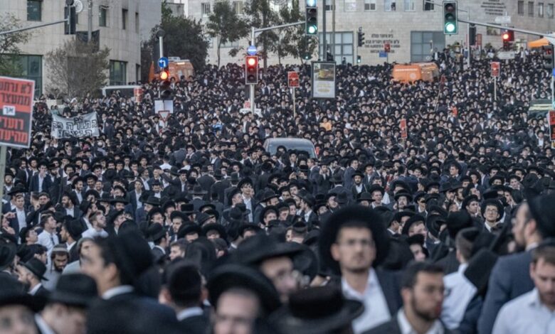 বৃহস্পতিবার (৩০ অক্টোবর) জেরুজালেমে ৩ লাখেরও বেশি অতি অর্থোডক্স ইহুদি (হারেদিম) বাধ্যতামূলক সামরিক বাহিনীতে যোগদানের বিরুদ্ধে বিশাল বিক্ষোভে জড়ো হয়েছিল। হিব্রু মিডিয়া লাখো মানুষের এই বিক্ষোভকে ‘মিলিয়ন-ম্যান মার্চ’ নামে অভিহিত করেছে।
